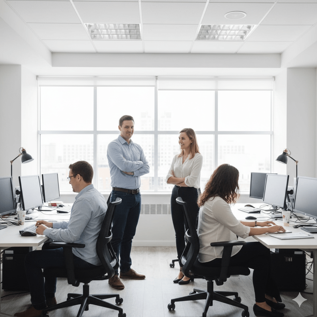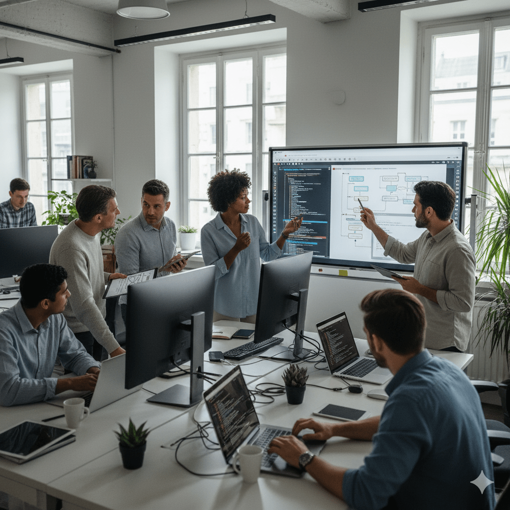 “Şirketimizin başarılı yazılım geliştirme ekibini gösteren profesyonel bir ofis fotoğrafı.”