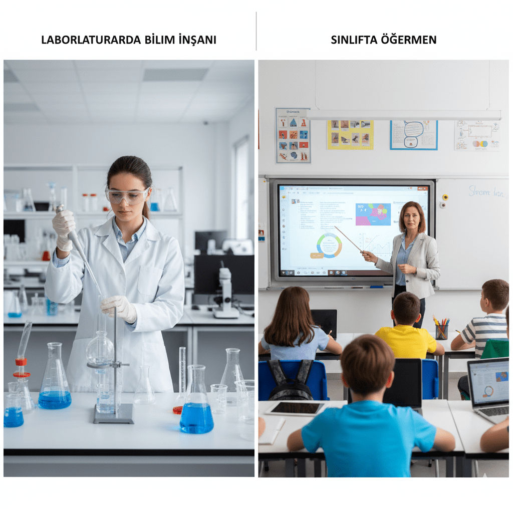 “Bilim insanının laboratuvarda çalışırken ve öğretmenin sınıfta ders anlatırken görselleri.”