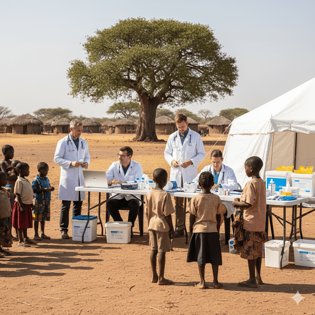 “Batılı doktorların Afrika’daki çocuklara tıbbi yardım götürdüğü bir sağlık kampanyası görseli oluştur. Doktorlar modern ekipmanla, yerel halk basit kıyafetlerle.”