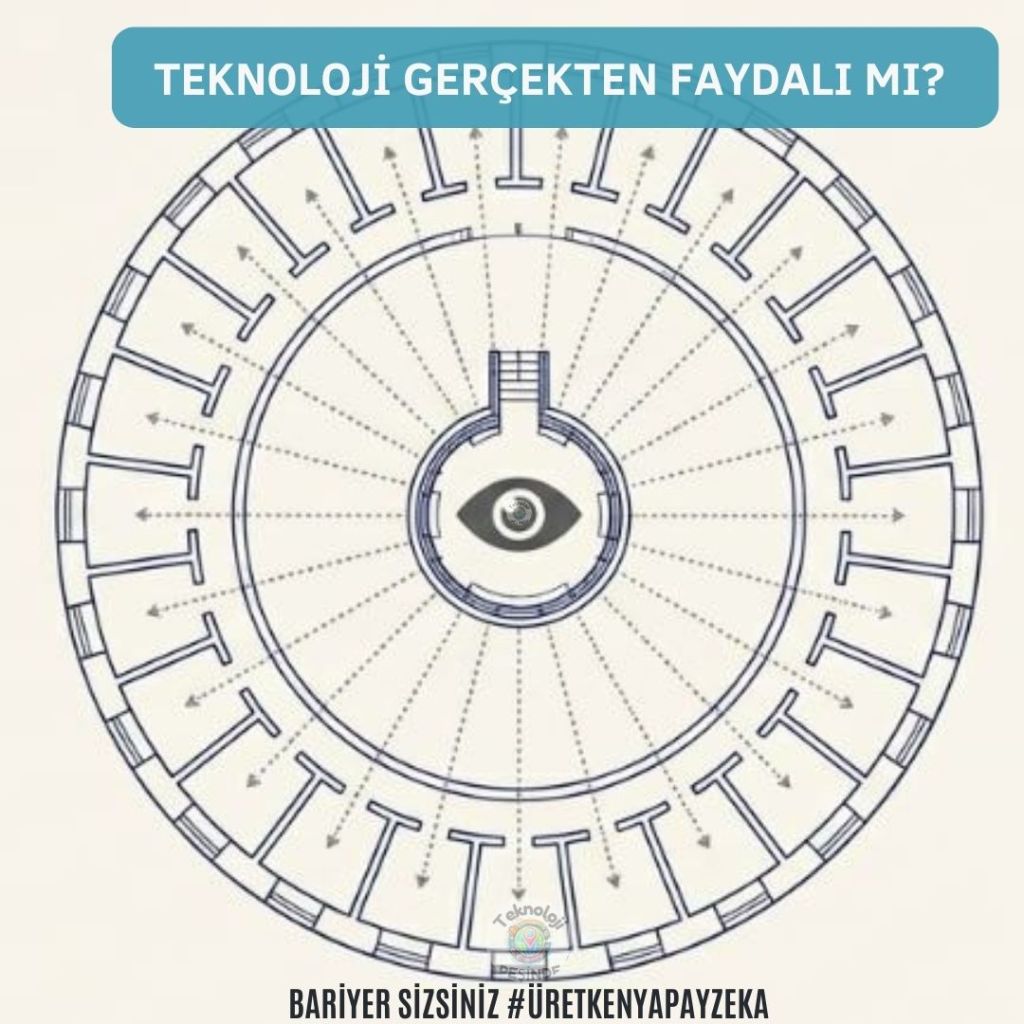 Panoptikon, 1791 yılında Jeremy Bentham tarafından önerilen, toplumsal verimliliği artırmayı amaçlayan dairesel bir hapishane tasarımıdır. Merkezde bir gözetleme kulesi ve bu kulenin etrafındaki hücrelerden oluşur. Doğru ışıklandırma sayesinde bu yapı, merkezdeki gardiyanlar herkesi her an izliyormuş izlenimi yaratır. Bu sistem, insanların her an gözlemlendiklerini düşünerek kendi davranışlarını kendilerinin denetlemesini sağlar, bu da iyi davranışın düşük maliyetle ve verimli bir şekilde garanti altına alınması anlamına gelir 19. yüzyılda Panoptikon’a özenilerek inşa edilen tekstik fabrikalarındaki makineler usta dokumacıların işlerini ellerinden aldığında bu sadece verimlilik değildi. Jeremy Bentham’ın Panoptikon hapishane tasarımı gibi, fabrikalar da işçileri gözetlemek ve emeği kontrol etmek üzerine kurulmuştu. Bentham’ın vizyonu, fabrikalardaki bu gözetimin işçileri daha çok çalışmaya zorlayacağını, böylece sahiplerin işçilere daha yüksek ücret ödemek zorunda kalmadan zenginleşeceğini öngörmüştür. Teknoloji, işçiyi güçlendirmek yerine onu denetlemek için kullanıldı.
